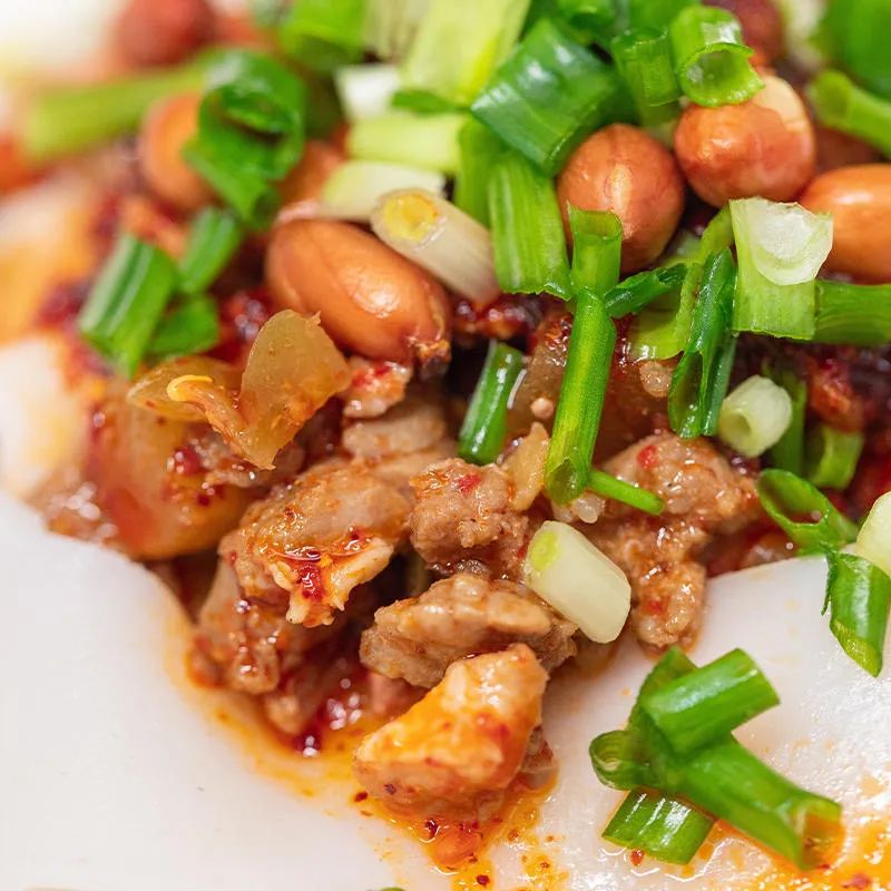 淋上我们的特色油辣椒,舀两勺我们的秘制肉丁。