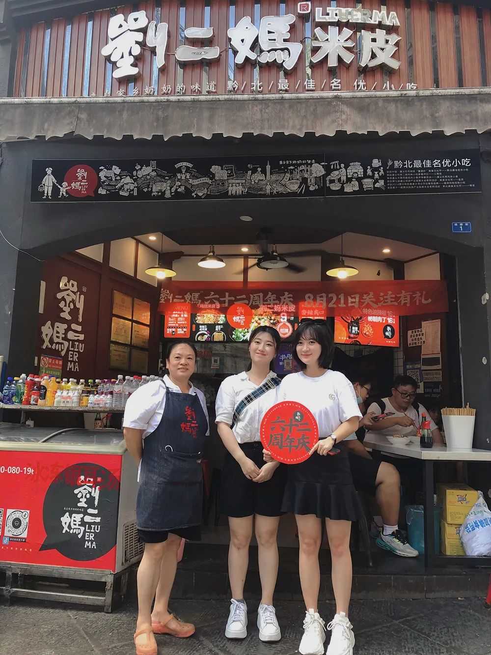 确定了拍摄事项后,接着就是执笔主编的到实地的调研和策划工作了,开启了更为详尽的第二次导游遵义之行。执笔主编韩老师来的时间正好是8月21日,我们刘二妈六十二周年的活动日。烈日当空的大暑夏季,我带着中午刚到遵义办好入住的韩老师开启了市区门店的暴走模式,热是真的热,还好对于没有来过遵义的韩老师充满了职业的好奇,她还说她朋友知道她要来遵义,特别大众点评帮她推荐了一家当地美食一定要去试一试,正巧了,正是她要执笔调研的这家刘二妈米皮,有些时候有些事情很奇妙,所以我说的刚好真的是刚刚好。我们这样的重口味让生活在北京的韩老师也能基本承受,吃到过很多地方美食去到过多种气质的城市,她还是非常认真的聆听着我作为刘二妈家第三代从奶奶的故事开始讲起。