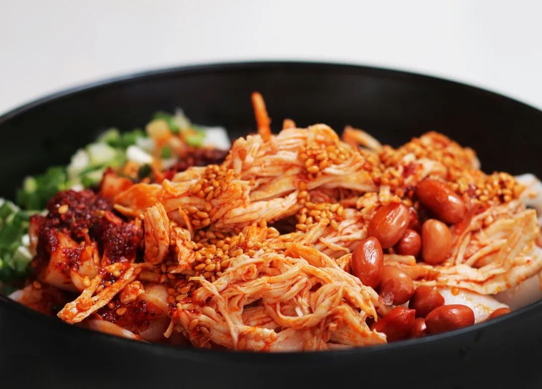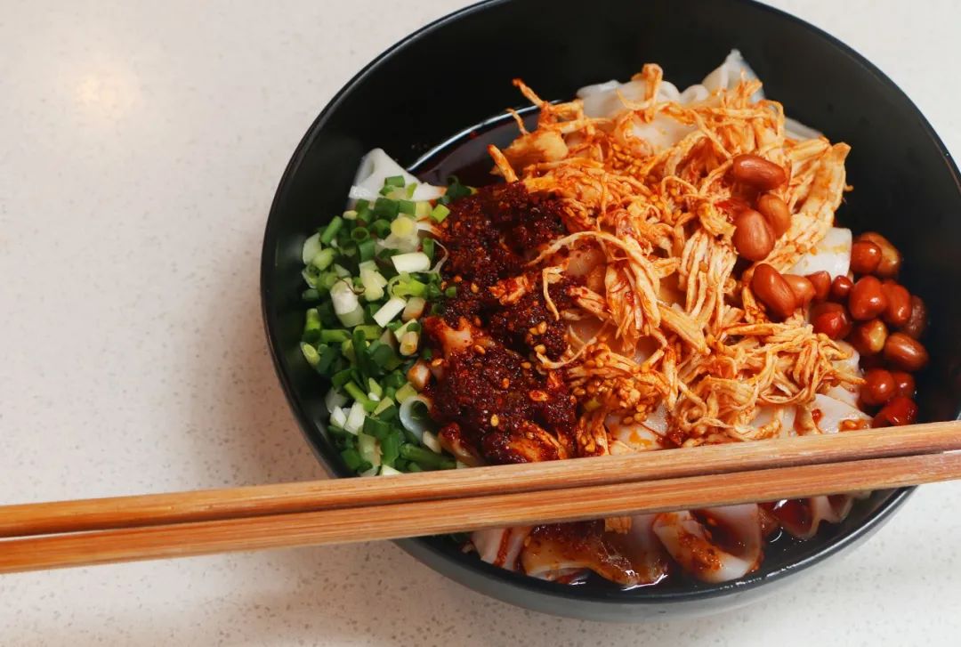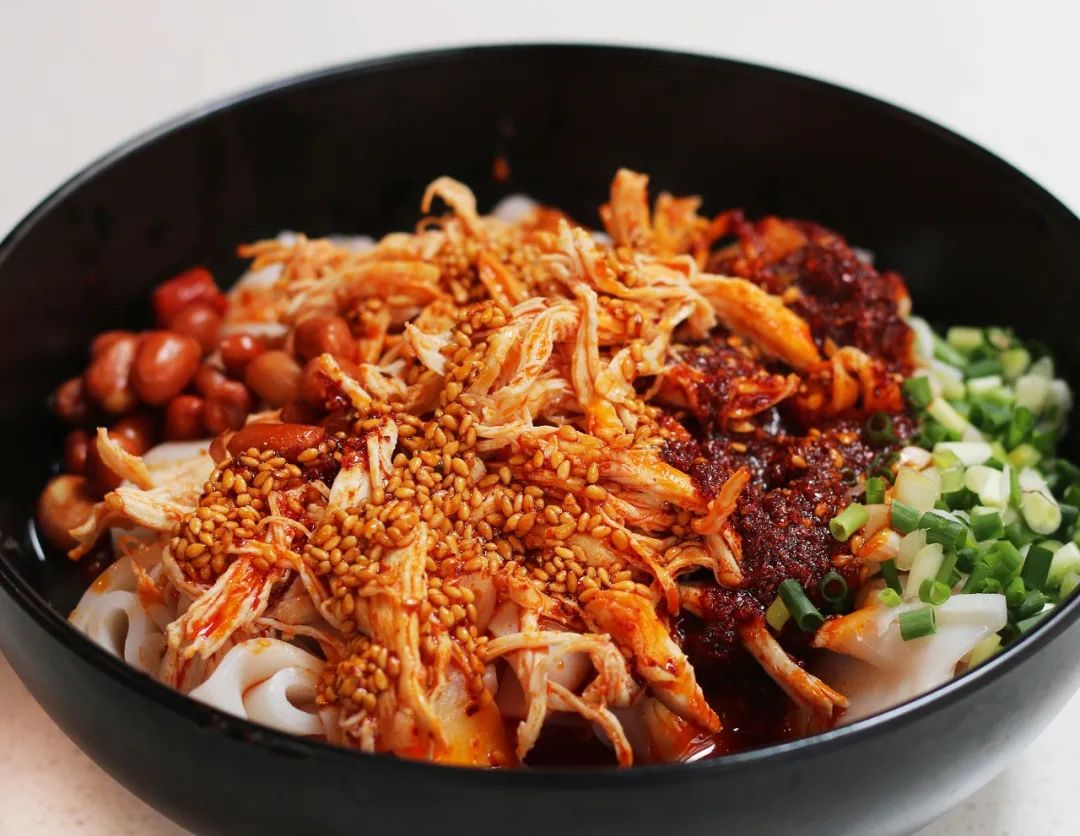 鸡丝米皮的鸡丝采用的是鸡胸肉,低脂健康,吃起来没有负担,爽口的同时也不会感到罪恶,用鸡丝作为浇头也是很多地方小吃的一个特色,尤其西南地区的麻辣鸡丝,色泽诱人,口感清爽。