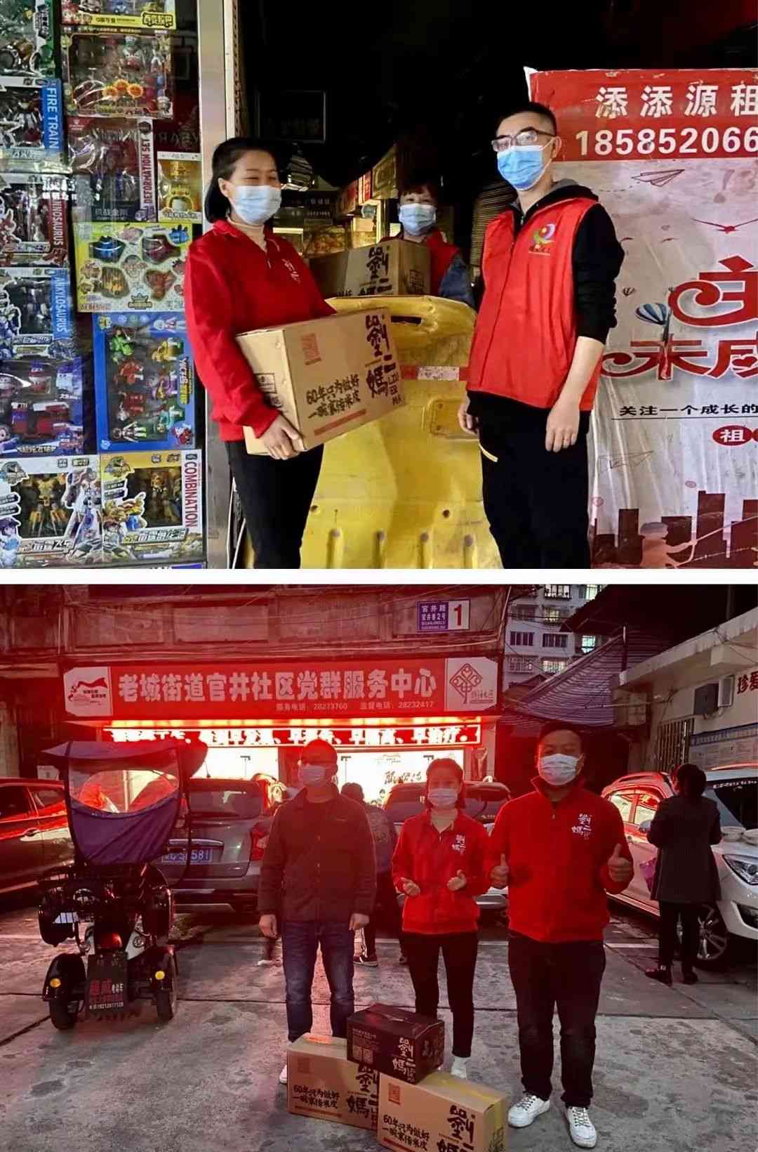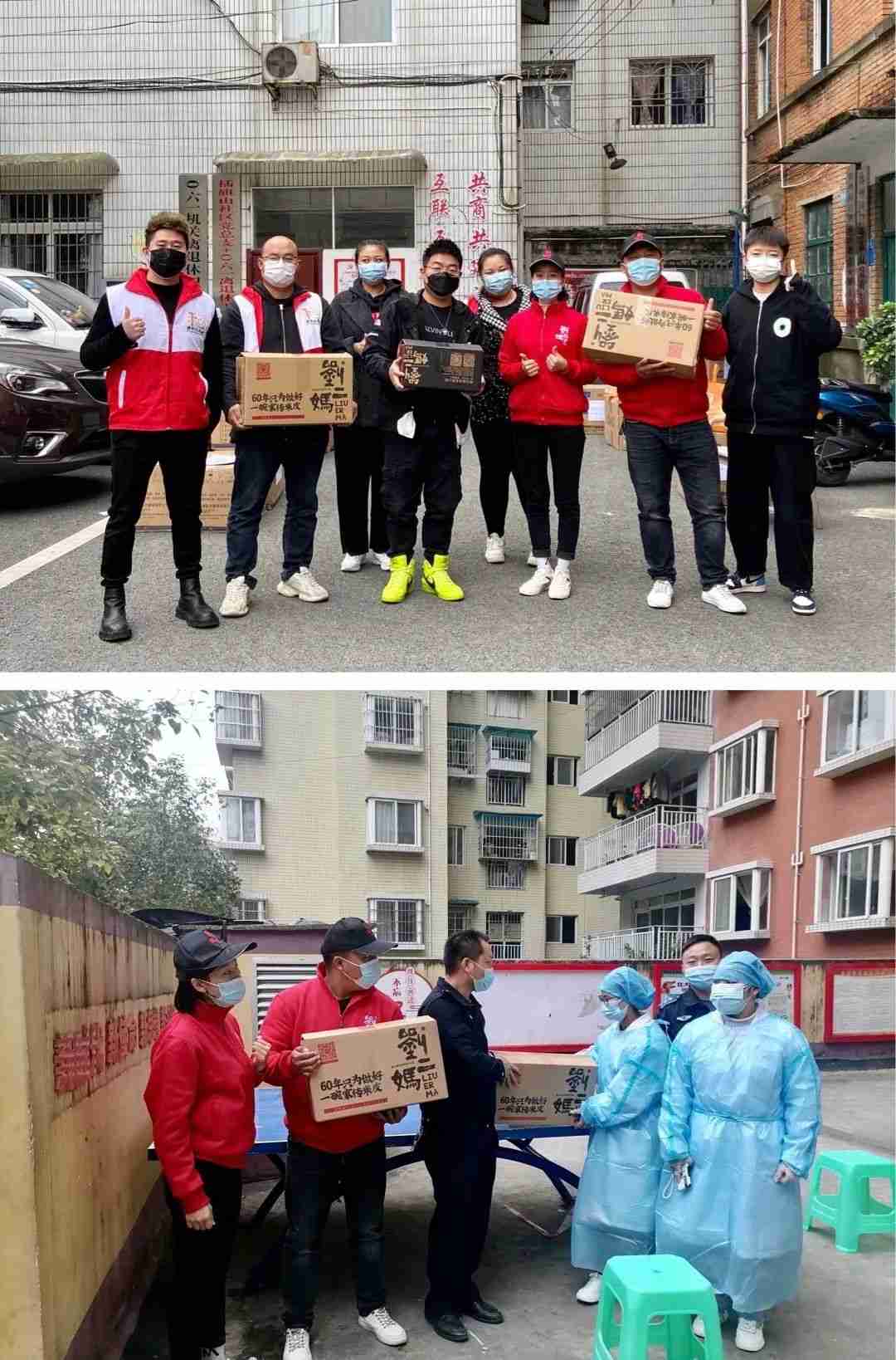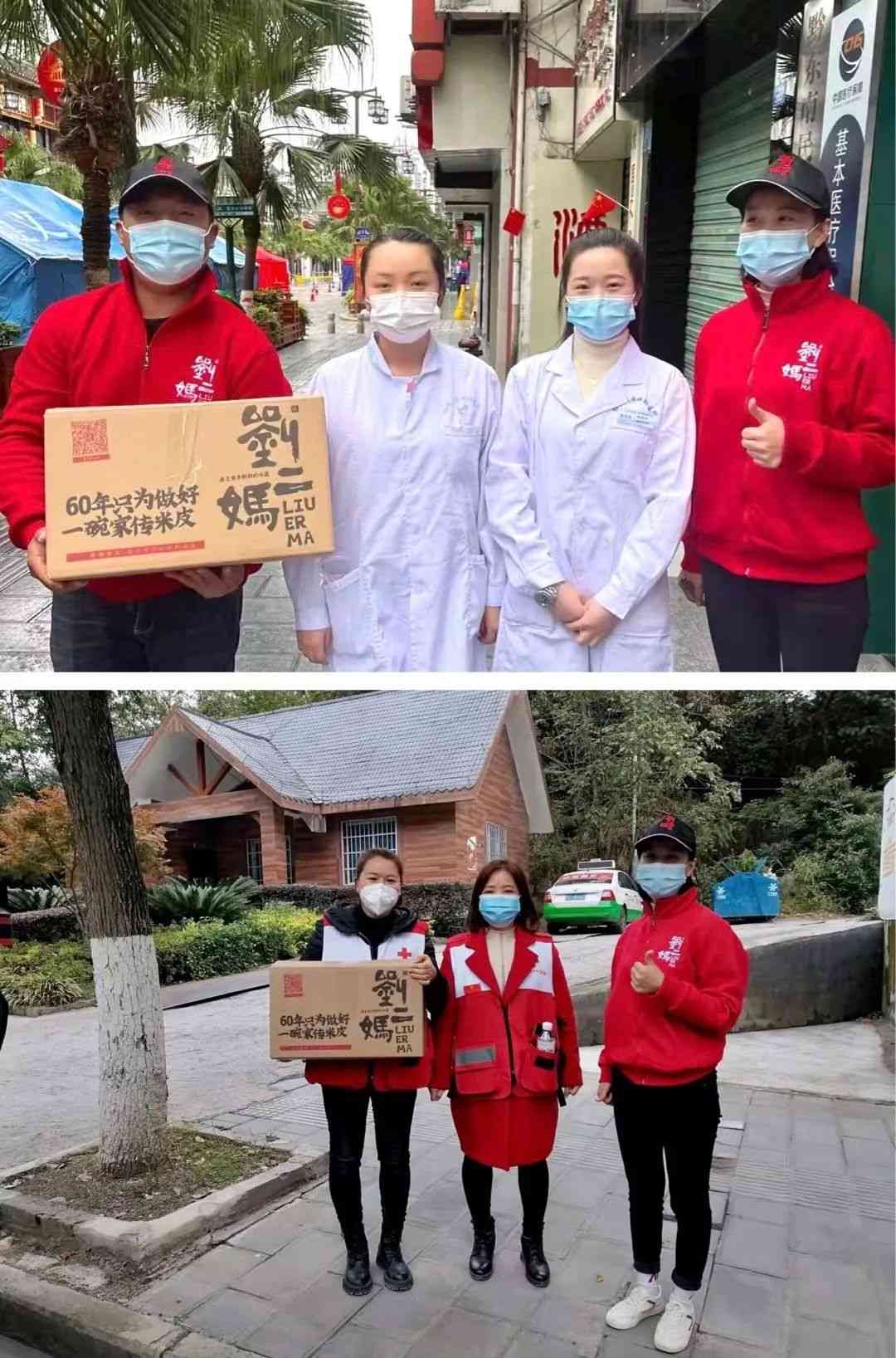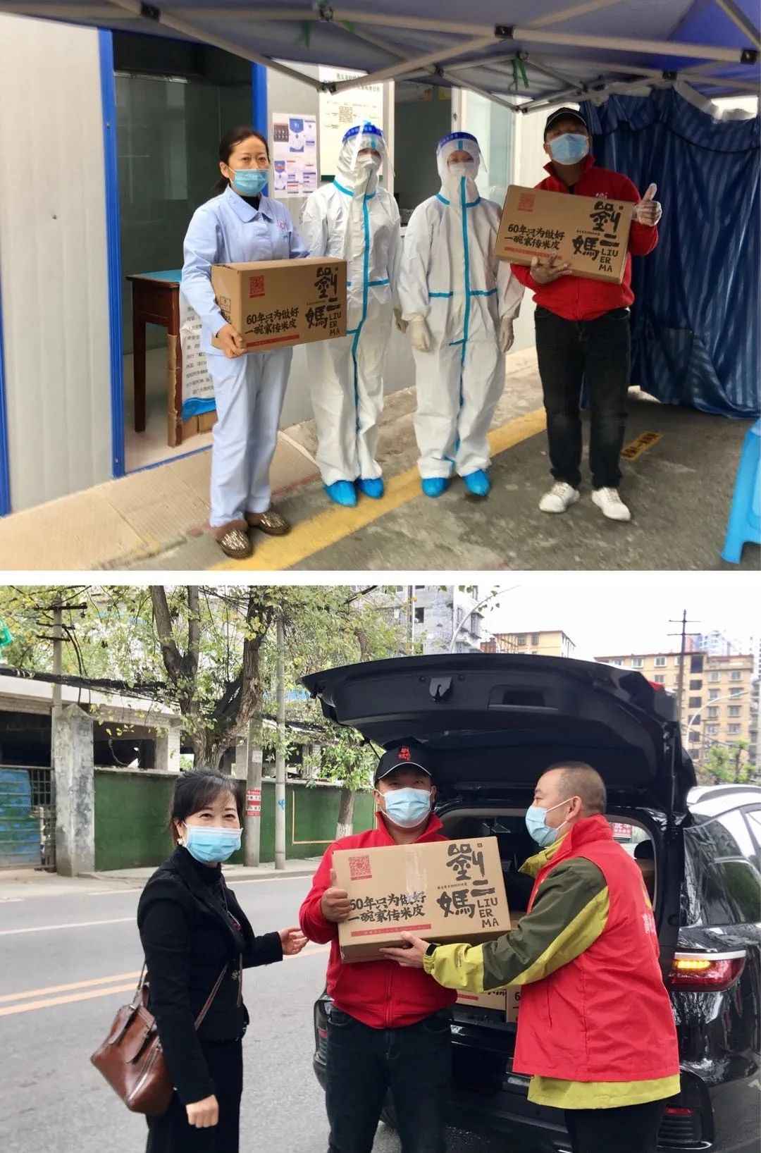 我们将打包装箱好的刘二妈米皮免费配送到一线的各个站点。