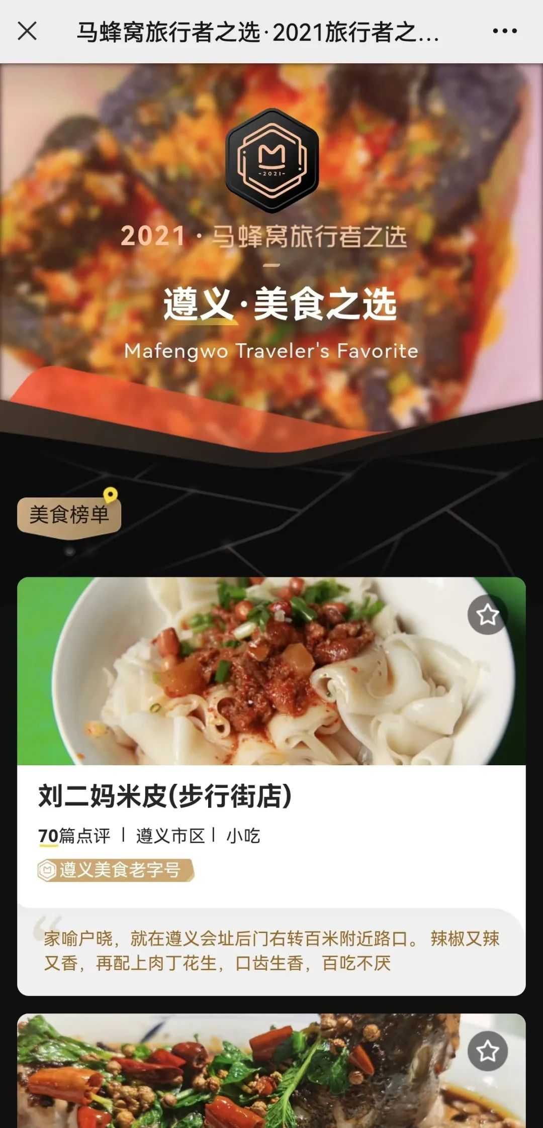 昨天,即2021年11月30日,由马蜂窝旅游主办的“2021中国新秘境”暨“马蜂窝旅行者之选”2021年度(贵州)颁奖礼在贵阳隆重举行,刘二妈米皮受邀参加,刘二妈米皮(步行街店)荣获2021年度贵州优选餐厅&小吃。