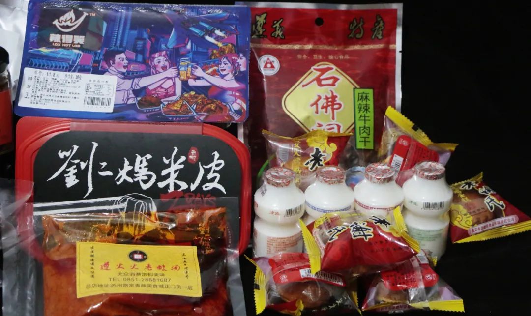 如图所示,所见即所得, 打开有十几样东西不说(每个盲盒都是超过10件家乡美食,只是组合搭配不一样),除了刘二妈还有其他遵义小吃,刻在骨子里的家乡美食DNA动了!