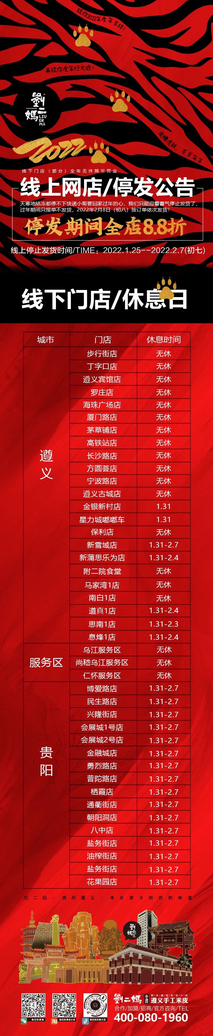 遵义等地区有19家门店全年无休陪大家一起过春节,其余门店大家按需出行,谨防跑空哦~