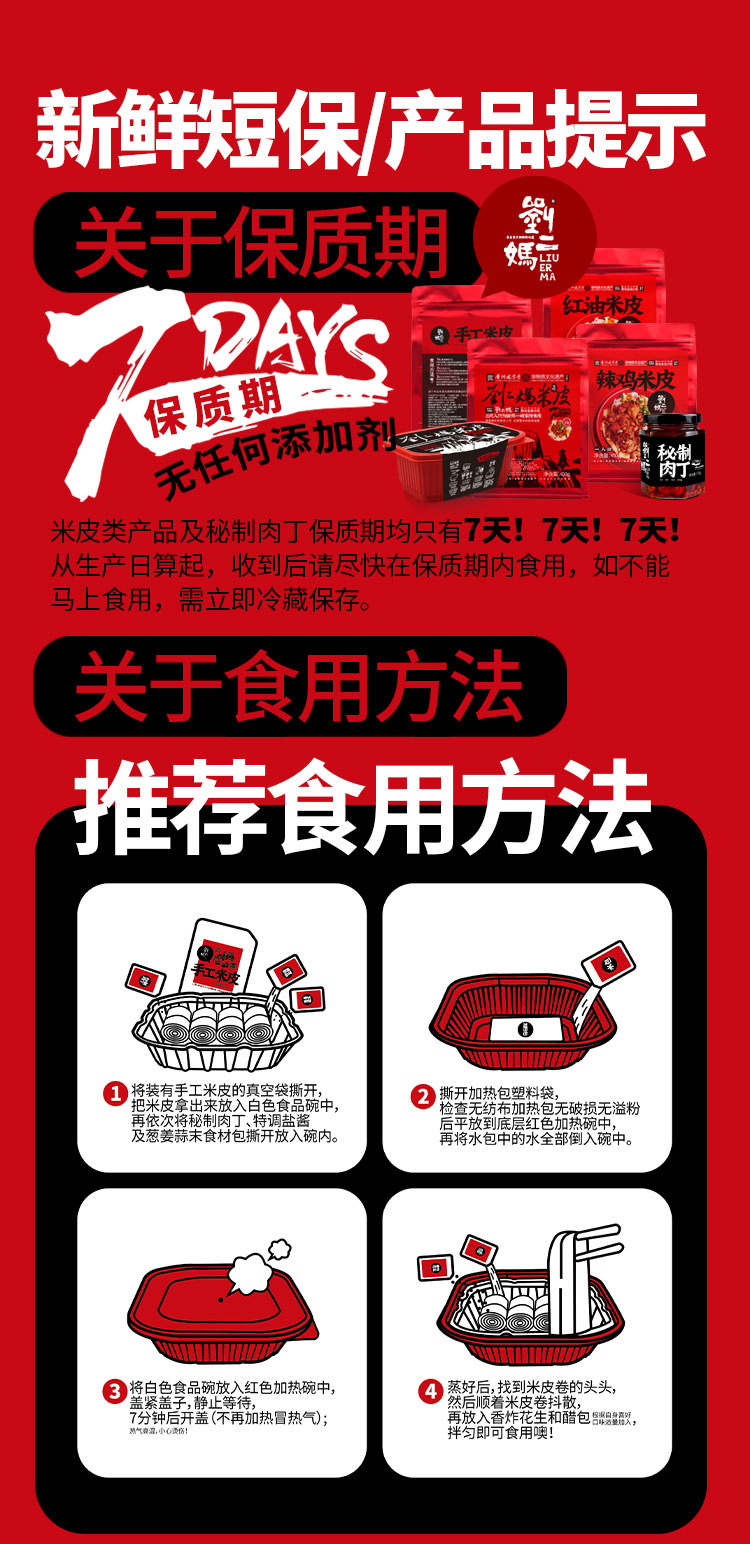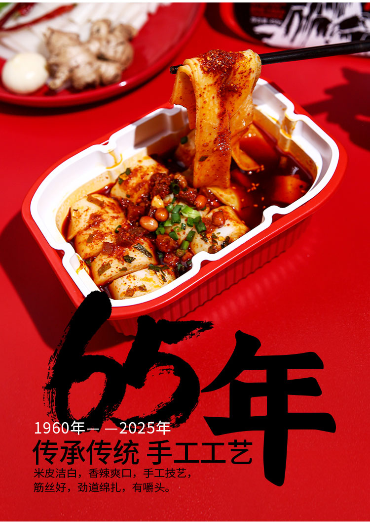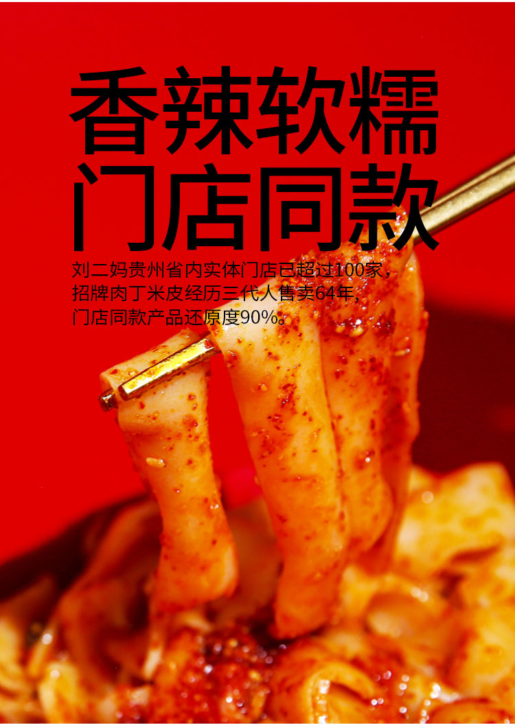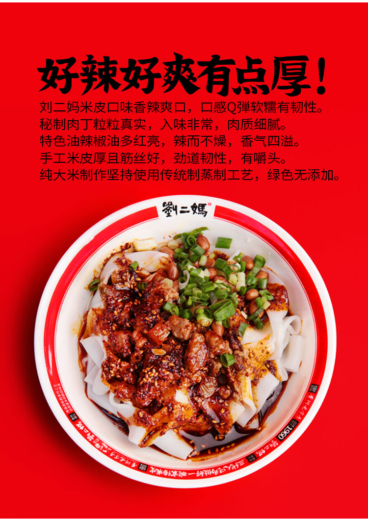 净含量:458g/盒(手工米皮/265g 秘制肉丁/90g 特调盐酱/85g 香炸花生/8g 葱姜蒜末/3g 酸醋/7g )