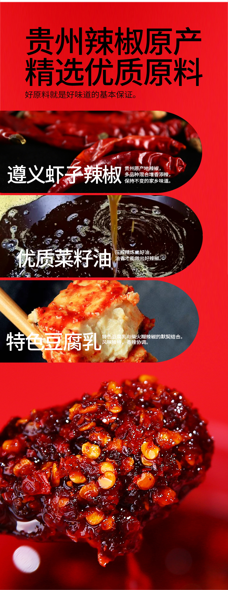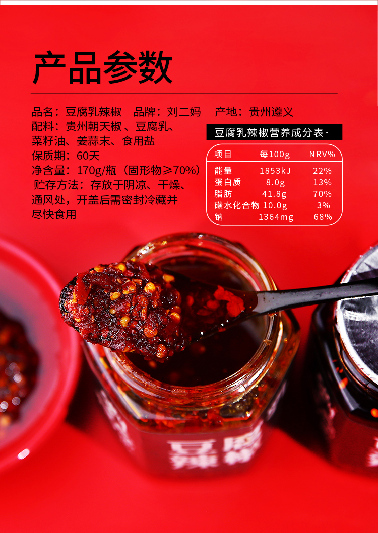 配料:贵州朝天椒、豆腐乳、菜籽油、食用盐、姜蒜